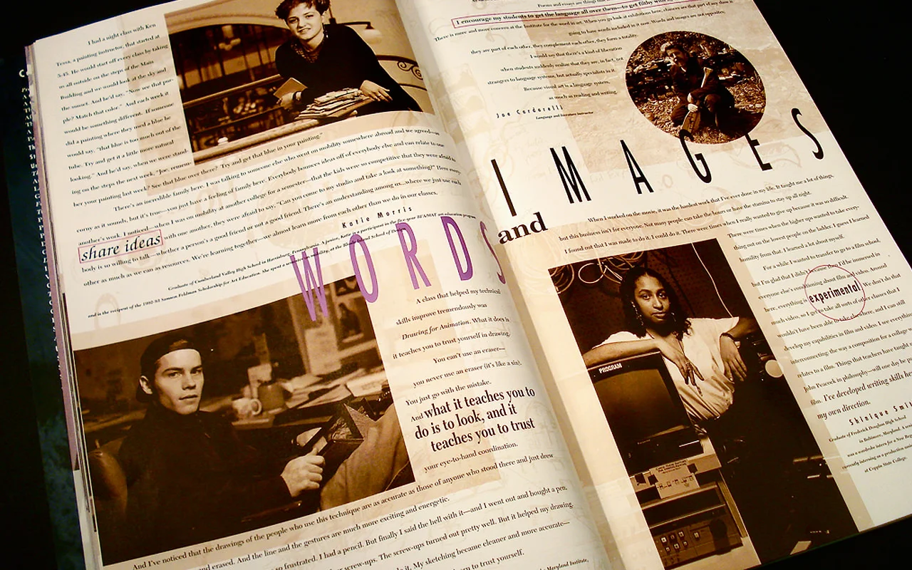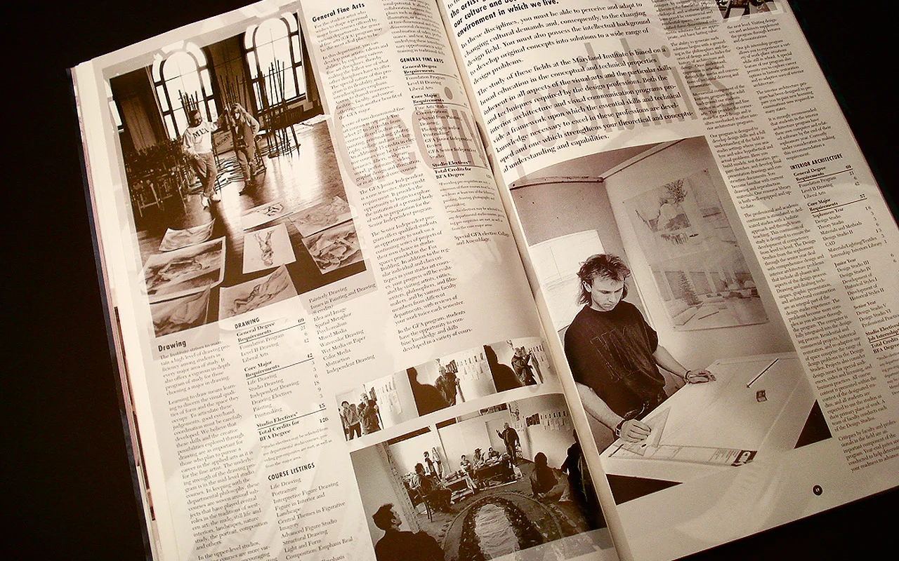 While working at Franek Design Inc, I had the opportunity to design one of the first digitally produced print media catalogs for an art school. The catalog showcased MICA’s best features as well as its curriculum, faculty, and admissions information. A rich vibrant color palette was used to represent the diversity of attitudes and offerings within the school, as well as the uniqueness of the campus. Multiple typefaces were incorporated throughout the catalog, mixing cool and unconventional fonts with more traditional fonts, to create a “funky yet sophisticated” attitude.